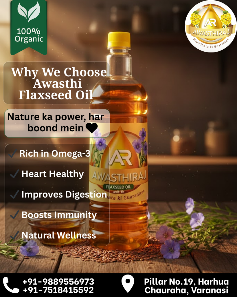 At Awasthi Oil Mill, every batch of flaxseed oil is carefully extracted using wooden kolhu technology, ensuring hygiene, transparency, and unmatched purity. We deliver traditional goodness with modern quality standards in every drop.
