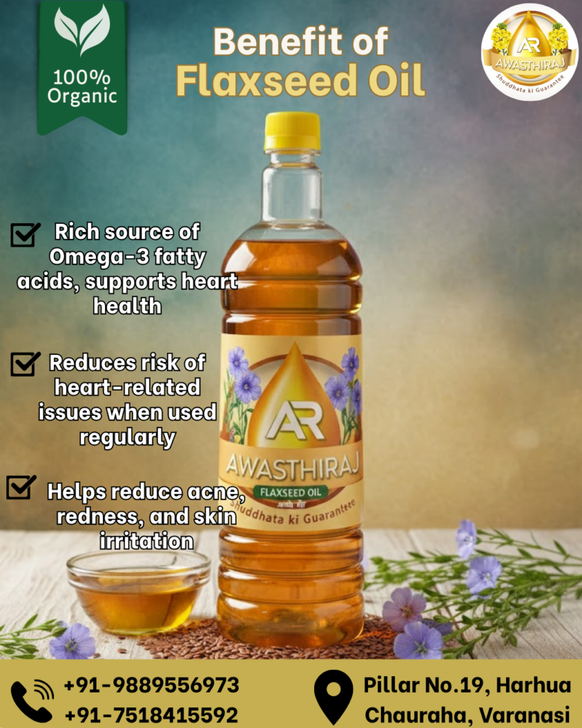 At Awasthi Oil Mill, our Flaxseed Oil is extracted using the traditional wooden cold-press (लकड़ी के कोल्हू) method to preserve its natural nutrients, mild nutty flavor, and therapeutic properties. Known for its rich Omega-3 content, flaxseed oil is ideal for health-conscious lifestyles.